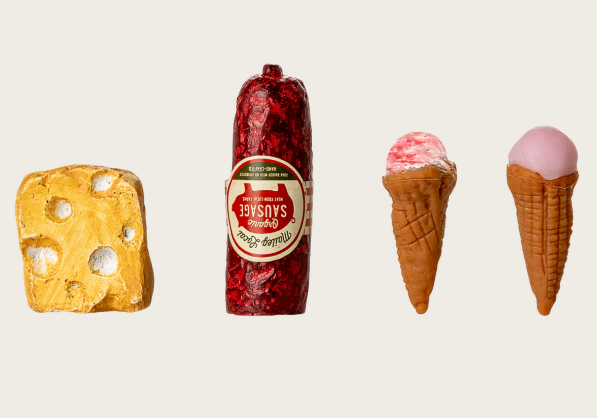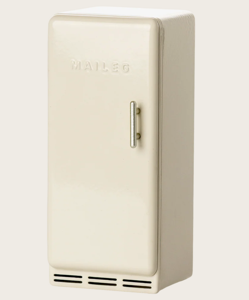 An old fashioned fridge that fits perfectly into the Maileg Mouse hole Farmhouse. Inside the fridge you will find a small cheese, sausage and some ice creams. These will extend the storytelling and play.