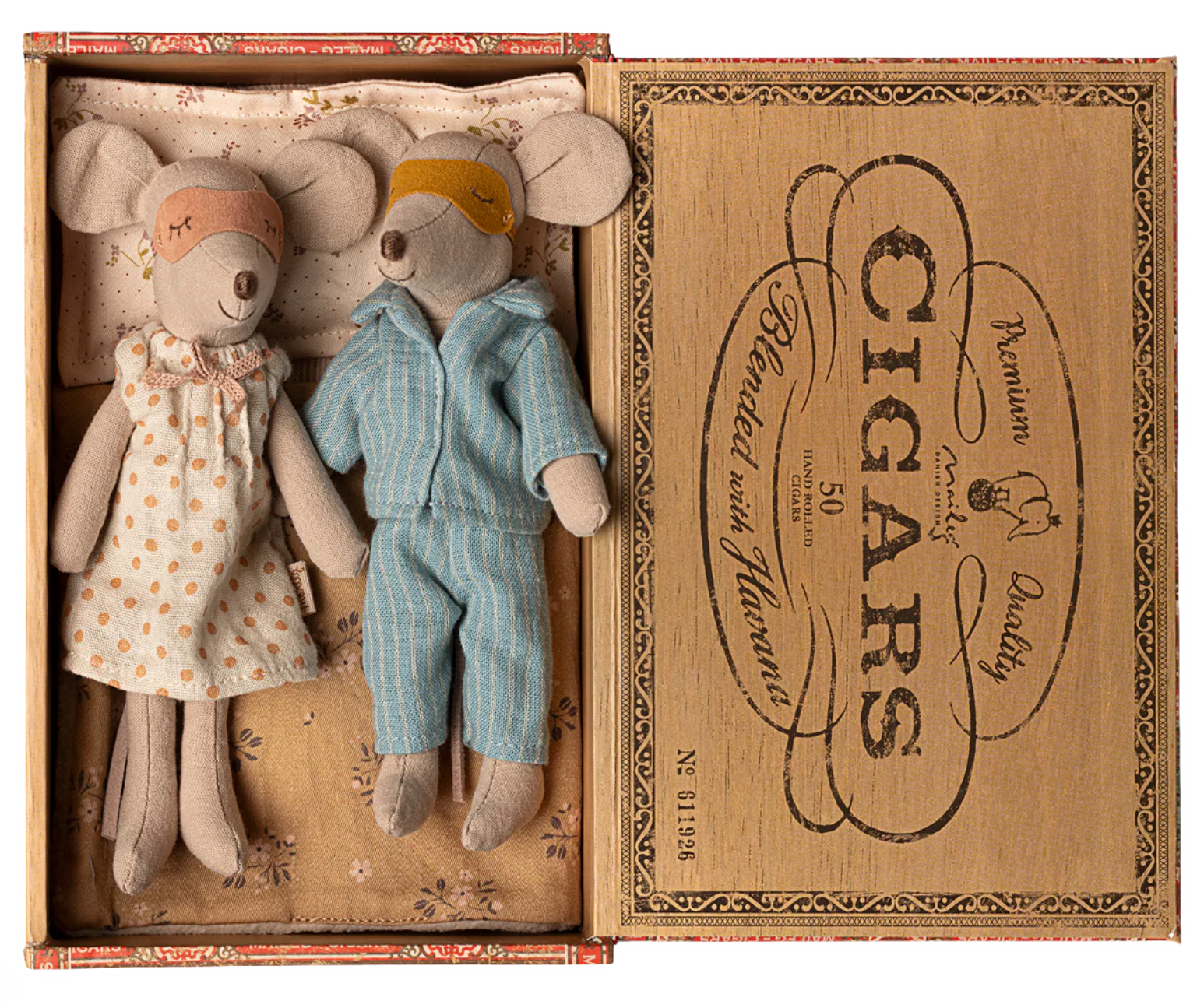 A classic Maileg item. Mom and Dad mice are wearing their beautiful nightwear and eye masks. The cigarbox is a perfect bed for a good night's sleep and sweet dreams.