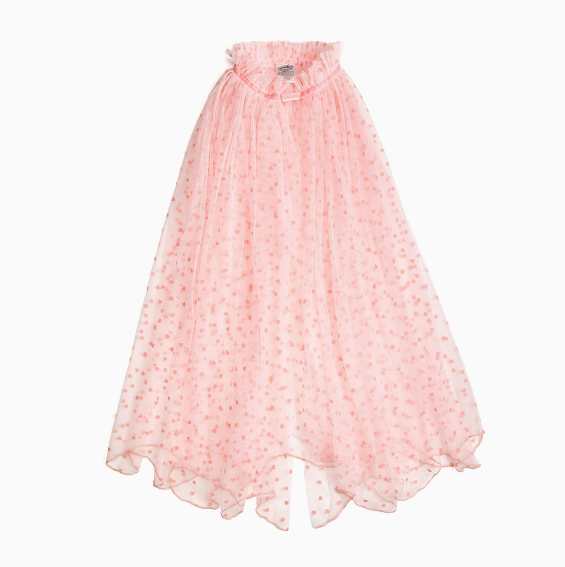 This pink tulle cape covered in tiny flocked hearts adds the perfect touch of sparkle and sweetness to any outfit! With its soft ruffled neckline and flowy hem, it’s a dreamy accessory for dress-up days or Valentine’s fun.