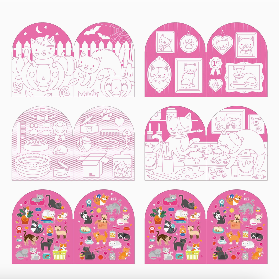 Color in the pawsome artwork of cheeky kittens hiding in bookshelves, making mischief at a tea party, playing dress-up, and many more adorable scenes of your favorite pet! When you’re done, decorate them with over 100 cat-themed stickers.