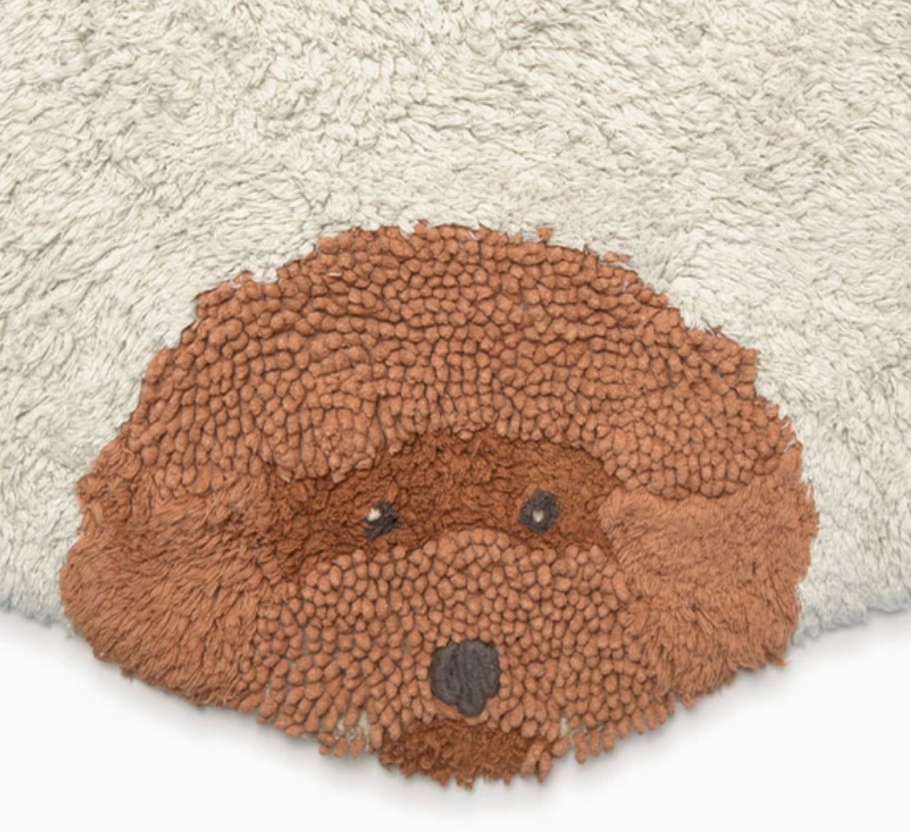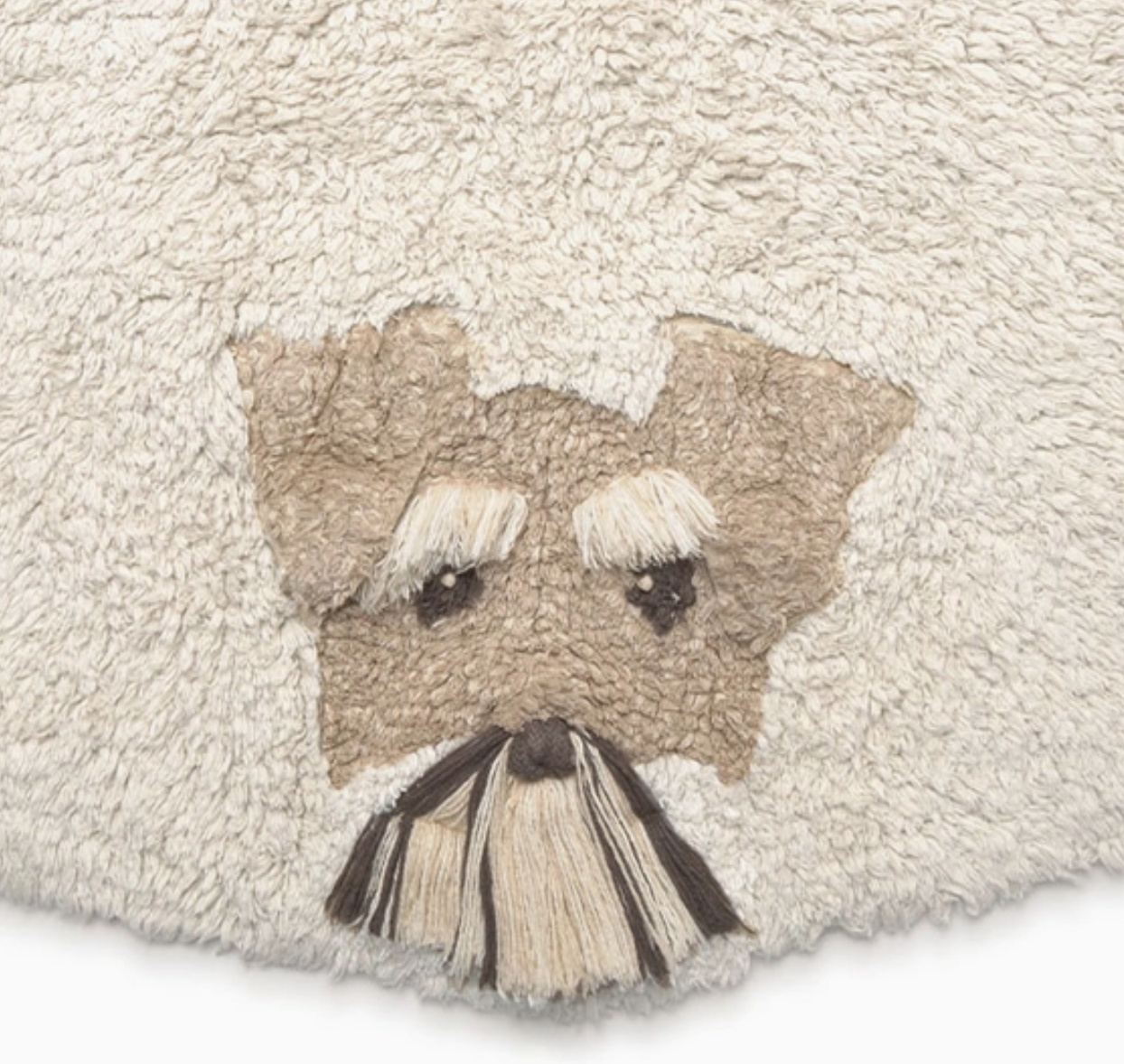 Meet your six favorite furry friends! A round washable rug in natural color, featuring the friendly faces of different lovable dog breeds. Each dog is handcrafted, with unique details like 3D ears, interactive tongues, whiskers, beards, and eyes made with knots to give them a realistic touch. An artisanal and interactive design that invites the little ones to discover, explore, and smile!