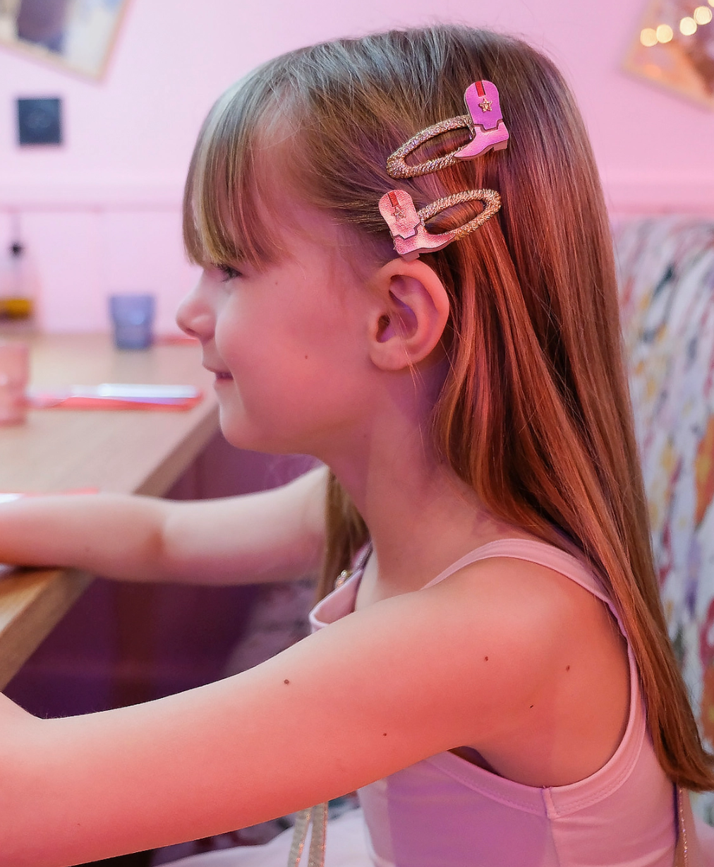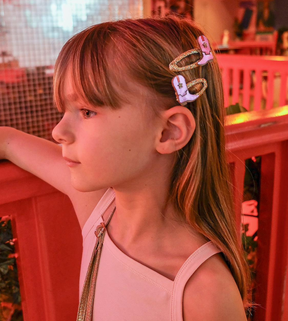 Yeehaw little cowgirls! These shimmering pink cowgirl boots are made for little dreamers and rhinestone lovers. Two pink PU boots with gorgeous glitter detailing are sat upon gold ribbon wrapped snap clips. The perfect accessory to have you shining brighter than a Tennessee star!