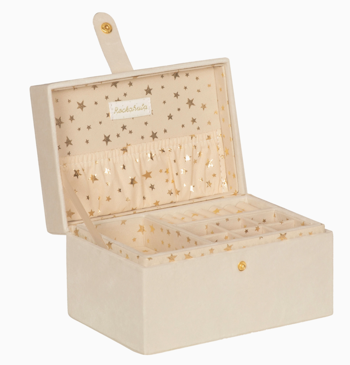 This lovely velvet jewelry box is the perfect place to keep all your Rockahula jewelry and favorite treasures safe! Featuring an embroidered pair of pink ballet slippers with satin ribbon detail, this jewelry box opens to reveal three compartments, a slip pocket and a dedicated space to slot earrings and rings.