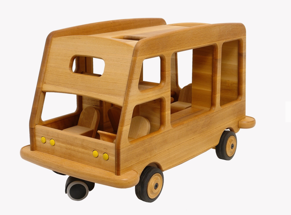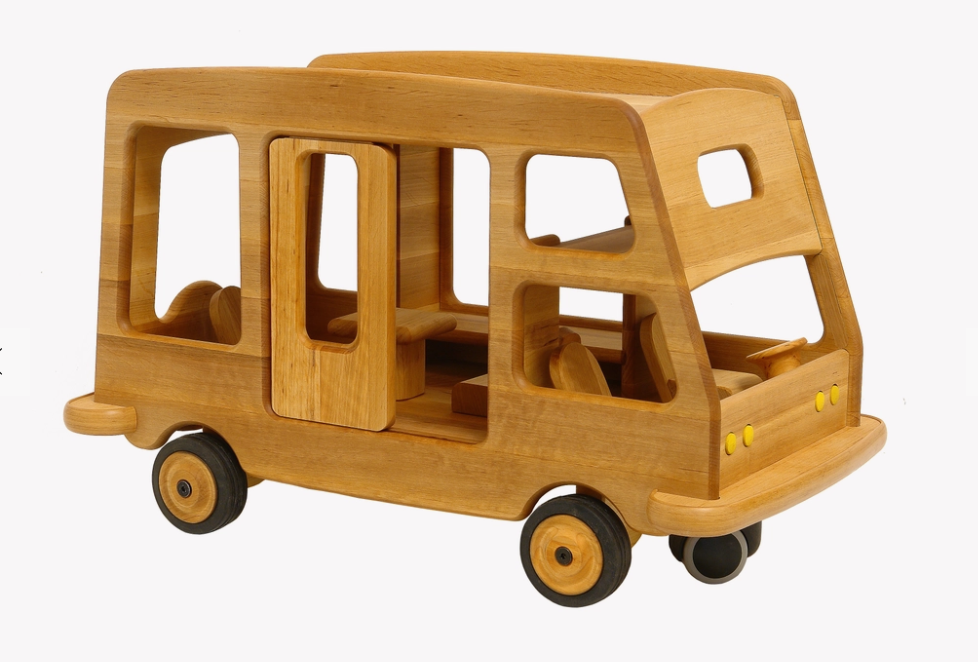 This large Camper Van is absolutely perfect for adventures. Solid timber construction, the vehicle is steerable and comes packed with features including cabin seats that are fixed, and loose furniture that can be rearrange inside and outside of the van: two seats, one table, kitchen counter with sink, and large pot with lid. Just the size for action-sized dolls and figures, and big for Maileg Mice, but still a perfectly fun fit for imaginary play.