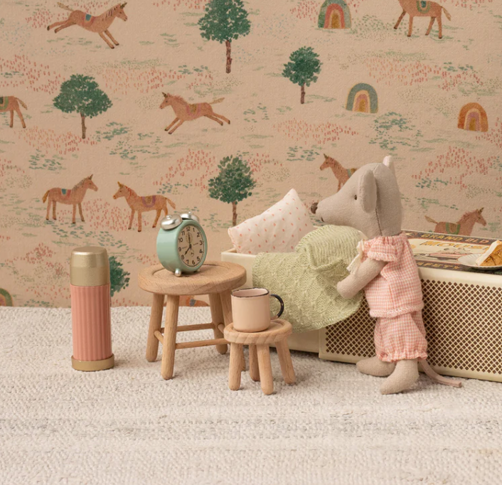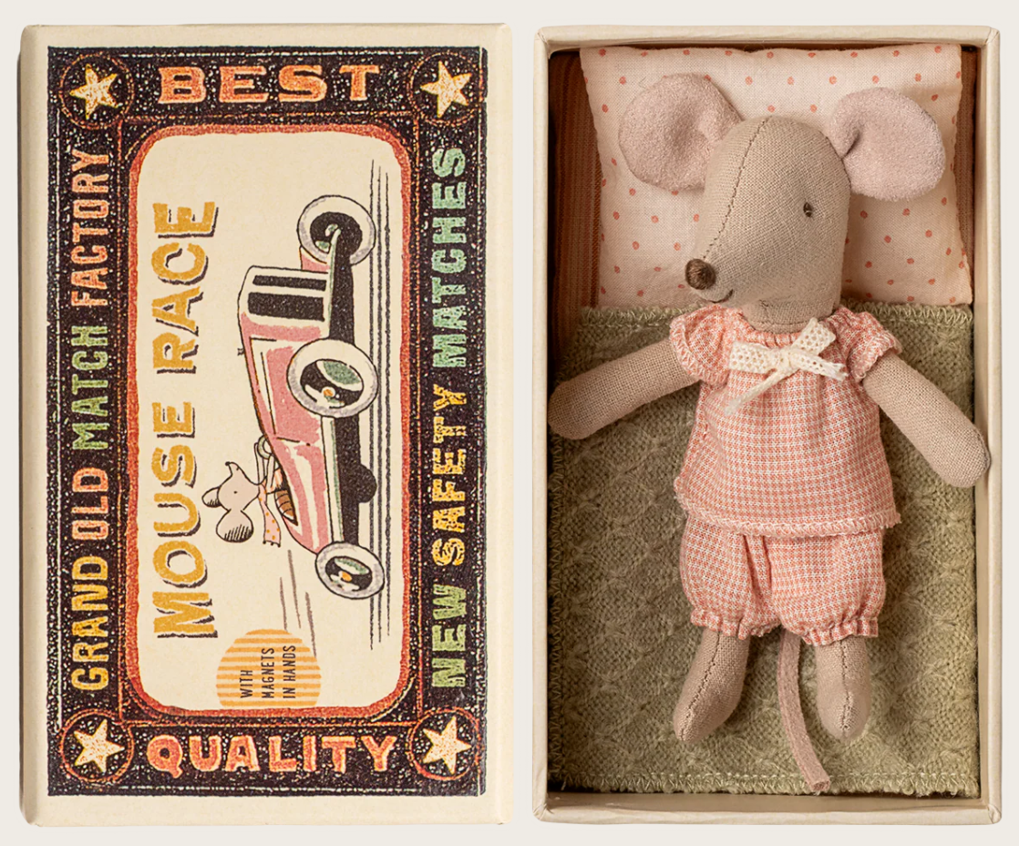 A classic Maileg item, this mouse is ready for hours of play and sleeps soundly in its little matchbox. The clothes and bedding are made of soft fabrics with unique prints in beautiful colors. The mouse has magnets in its hands.