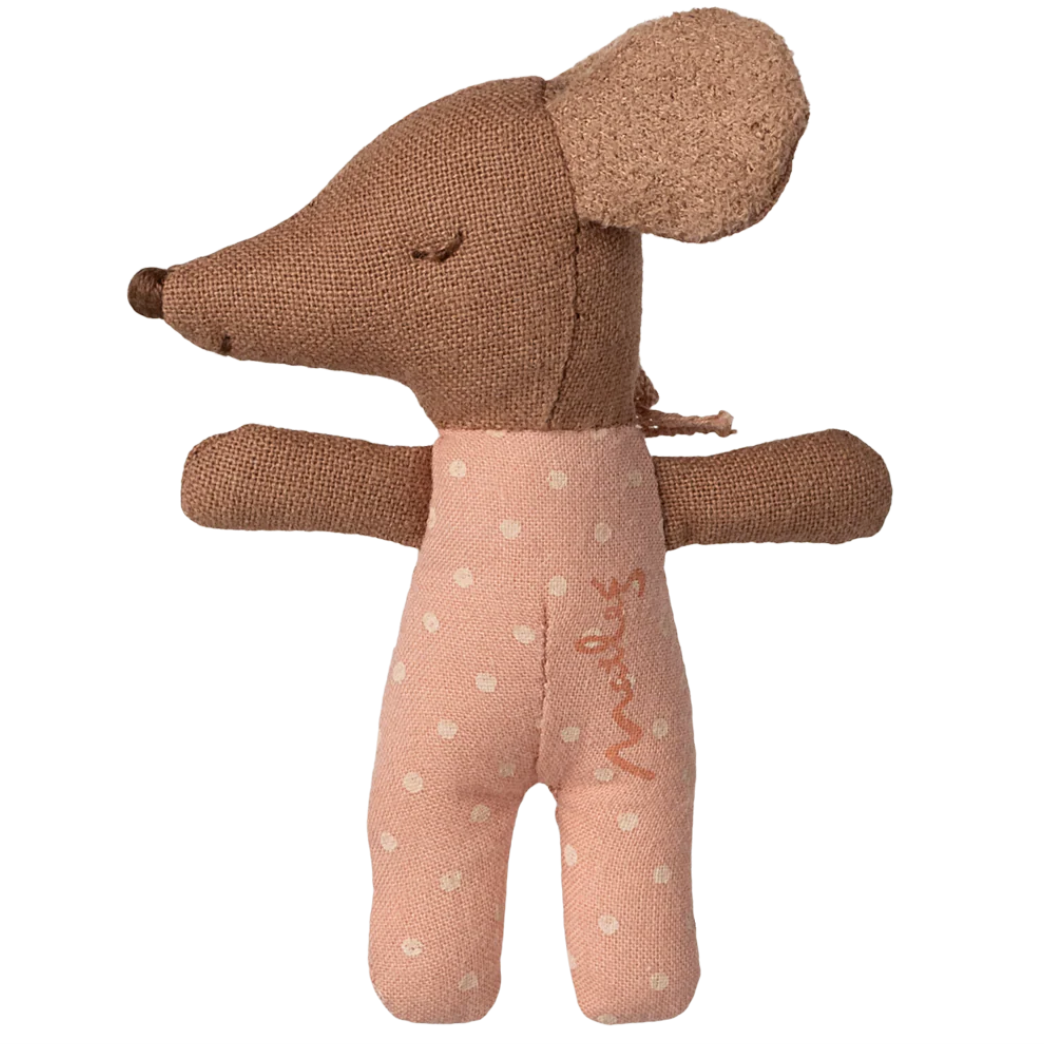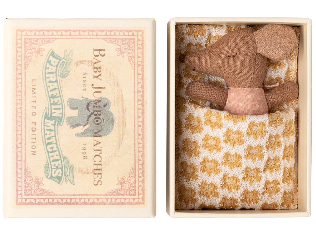 A Maileg favourite, this Baby Mouse comes tucked inside her very own matchbox bed. Dressed in a cosy spotted suit with a pink bow, she rests on soft patterned bedding, ready for sweet dreams. Her face is double-sided, with one side sleepy and the other wakey, so you can choose whether she is ready for a peaceful slumber or a day of play.