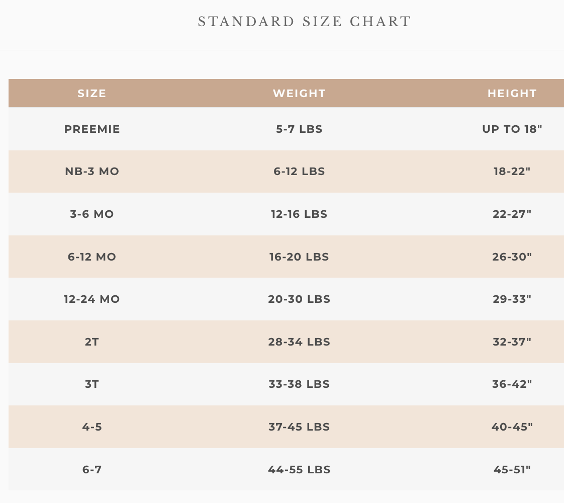 • 6-12 Month: 16-20 pounds // 26-30” long